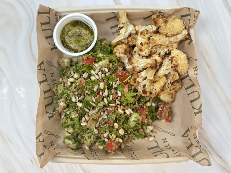 Lunch Box l Roast Cauliflower Florets, Quinoa Tabbouleh with Herbs, green herb dressing (Vegan) GF