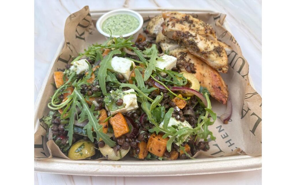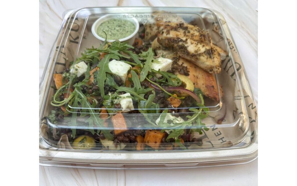 Roasted sweet potato and puy lentils with za’atar-marinated chicken, rocket & olives, served with a refreshing herbed yoghurt dressing.