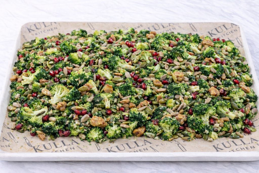 Broccoli salad with toasted pistachios, mint, fresh red chilli, pumpkin seeds and sweet dates, finished with a zesty lime and chilli dressing.