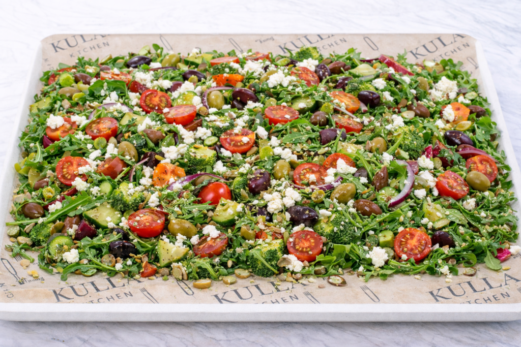 Rocket, mixed greens, cherry tomato, marinated olives, cucumber, red onion, sweet red pepper, crumbled feta, sourdough crouton crumbles, tossed in herb vinaigrette