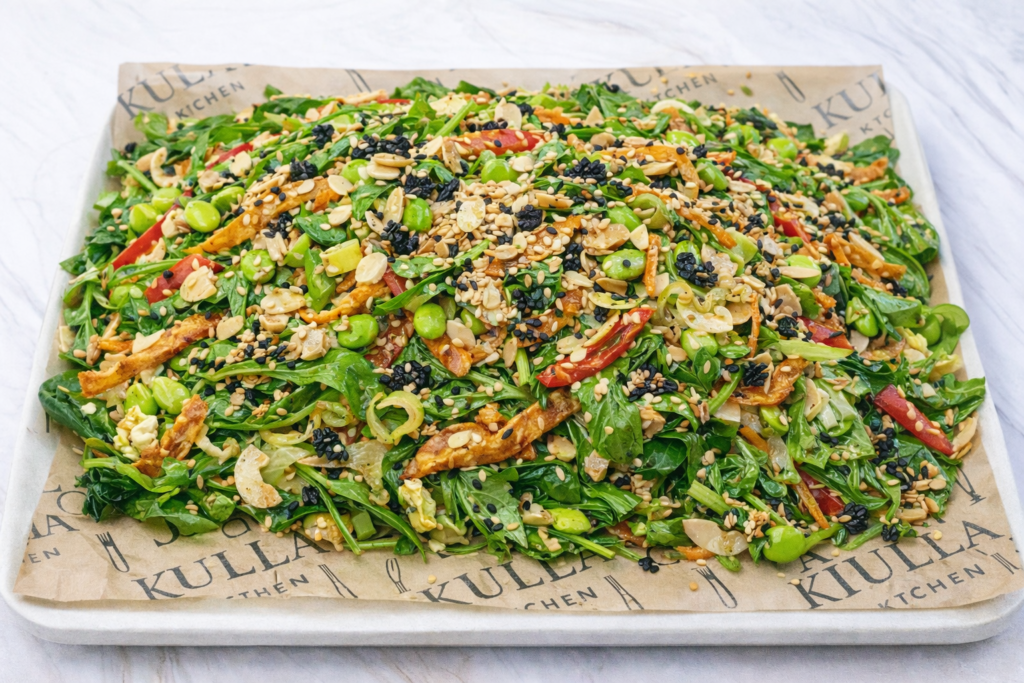 Crunchy flavours with basil, napa cabbage, mixed greens, edamame, red peppers, carrot, sesame seed & Thai almond dressing.