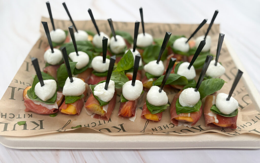 Skewers of Peach Slices, Prosciutto & Baby Mozzarella (GF)